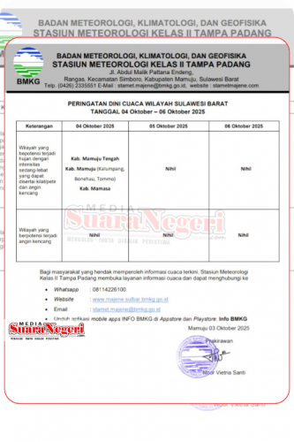 MAMUJU, Mediasuaranegeri.com – Badan Penanggulangan Bencana Daerah (BPBD) Provinsi Sulawesi Barat (Sulbar) menyampaikan informasi resmi dari BMKG Stasiun Meteorologi Kelas II Tampa Padang Mamuju terkait peringatan dini cuaca untuk periode 04-06 Oktober 2025.
