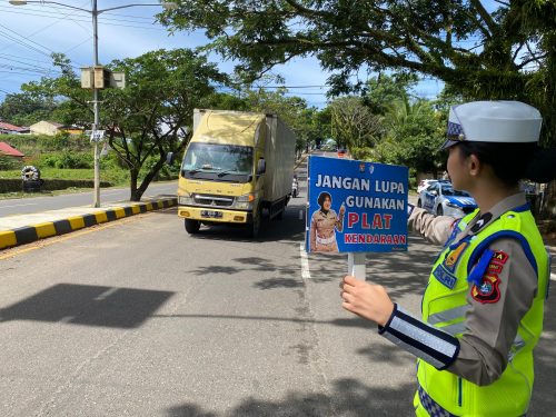Di lokasi operasi para petugas juga memegang papan himbauan yang jelas dan mudah dibaca, dengan pesan-pesan penting seperti “Ayo Tertib Berlalu Lintas, Keselamatan yang Pertama dan Utama, Hati-Hati di Jalan, Jangan Lupa Gunakan Helm SNI, Stop Melawan Arus dan Jangan Lupa Pasang Plat Kendaraan.”