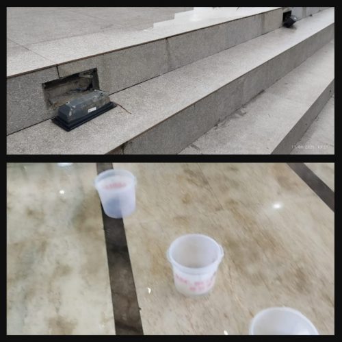 Tak hanya itu, tangga masjid yang selesai direnovasi tidak maksimal sesuai yang dilihat dilokasi serta bagian dinding tangga yang harusnya dilengkapi dengan lampu hias. Namun pekerjaan yang sudah selesai, lampu tangga tersebut tidak terpasang di tempat.