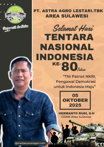 SULBAR, Mediasuaranegeri.com – Dalam rangka memperingati Hari Ulang Tahun Tentara Nasional Indonesia (TNI) ke-80 yang jatuh pada 5 Oktober 2025, PT Astra Agro Lestari Tbk, Area Sulawesi melalui CDAM Hermato Rudi, S.H, menyampaikan ucapan selamat dan apresiasi atas dedikasi serta pengabdian TNI kepada bangsa dan negara.