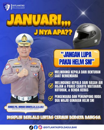 Melalui kampanye visual yang menghadirkan Direktur Lalu Lintas Polda Sulbar Kombes Pol. Nurhadi Ismanto, pesan kuat “Ayo Pakai Helm SNI” digaungkan secara luas. Helm bukan sekadar aksesori, melainkan perlindungan utama bagi kepala saat berkendara.