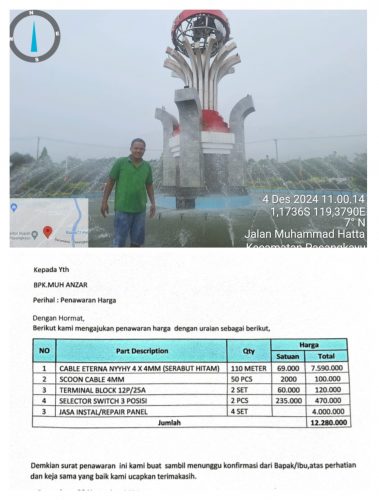 Setelah pekerjaan rampung, tepatnya pada akhir Desember 2024, Ansar kemudian mengajukan permintaan pembayaran disertai rincian pekerjaan dan material dengan total nilai sekitar Rp12 juta, sebagaimana tercantum dalam dokumen penawaran.